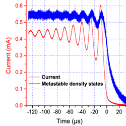The post-discharge of an RF plasma torch supplied with helium and oxygen gases is characterized by mass spectrometry, optical emission spectroscopy and electrical measurements. We have proved the existence of a dc current in the post-discharge (1–20μA), attributed to the Penning ionization of atmospheric nitrogen and oxygenated species. The mechanisms ruling this dc current are investigated through experiments in which we discuss the influence of the O2 flow rate, the He flow rate and the distance separating the plasma torch from a material surface located downstream.